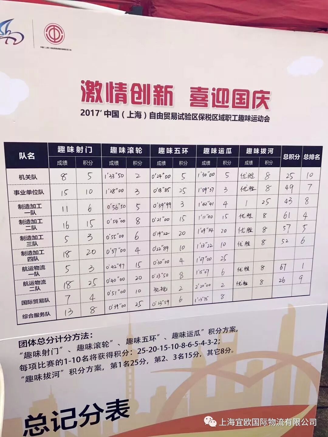 今天下午,“激情创新、喜迎国庆”2017中国(上海)自贸区保税区域职工趣味运动会在上海滩运动公社隆重举行!活动旨在提高职工综合素质、丰富职工文化生活、提升凝聚力、向心力、营造和谐稳定、积极向上、团结奋进的氛围!此次运动会共计10支队伍、300多名运动员参赛。宜欧物流组队积极参赛并获得了骄人成绩!